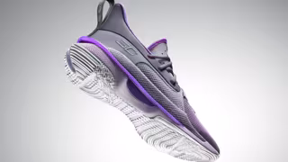 La variante de color Curry 7 Bamazing presenta una pala transpirable que luce una mezcla de tonos grises y morados. El talón, que cuenta con las dos tecnologías de amortiguación UA HOVR y Micro G, está separado por una placa flexible que destaca en morado.