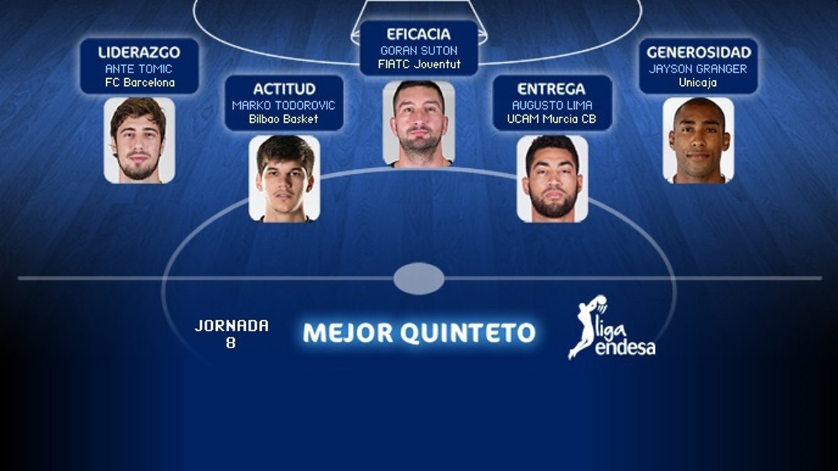 Ante Tomic (Liderazgo), Goran Suton (Eficacia), Marko Todorovic (Actitud), Jayson Granger (Generosidad) y Augusto Lima (Entrega) conforman el mejor quinteto de la Jornada 8 de la Liga Endesa 2014-15.