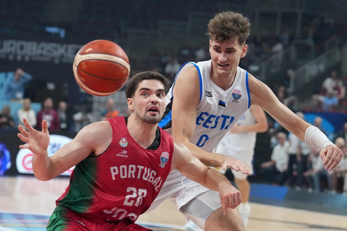 Henri Drell (derecha) en una acción del partido entre Estonia y Portugal en el EuroBasket 2025 - Europa Press/Contacto/Edijs Palens
