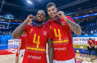 Archivo - Willy Hernángomez y Lorenzo Brown celebran el Eurobasket 2022. - ALBERTO NEVADO / FEB - Archivo