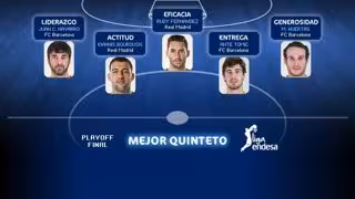 Los jugadores Juan Carlos Navarro (Liderazgo), Rudy Fernández (Eficacia), Ioannis Bourousis (Actitud), Marcelinho Huertas (Generosidad) y Ante Tomic (Entrega) conforman el Mejor Quinteto de la final de la Liga Endesa.