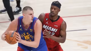 Nikola Jokic protege el balón ante Jimmy Butler en el Nugetts-Heat de las Finales de la NBA 2022-2023 - NBA ENTERTAINMENT