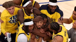 Los jugadores de los Pacers celebran la canasta de Tyrese Haliburton ante los Knicks en las Finales del Este de la NBA 24-25 - NBA