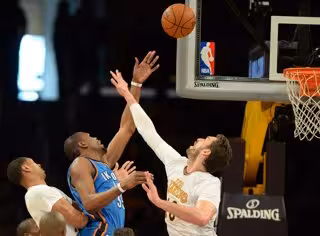 Los Angeles Lakers dieron una alegría a su público en el Staples Center con una victoria sufrida y trabajada (114-110) ante los Oklahoma City Thunder, donde los locales contaron con el pívot español Pau Gasol y un desatado Jodie Meeks para imponerse a los Thunder a pesar del triple doble de Kevin Durant y los 21 puntos del también español Serge Ibaka.