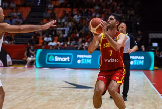 Archivo - Santiago Aldama of Spain in action during the FIBA Preolympic Tournament basketball match played between Spain and Lebanon at Fuente de San Luis pavilion on july 02, 2024, in Valencia, Spain. - Ivan Terron / AFP7 / Europa Press - Archivo