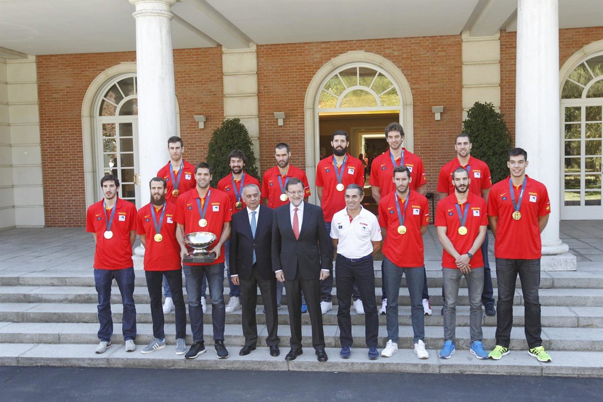 Rajoy posó en las escaleras de La Moncloa con los jugadores que llevaban el oro colgado al cuello y el trofeo del Eurobasket, así como el resto de la delegación de la selección nacional encabezada por el presidente de la Federación Española (FEB), José Luis Sáez, el vicepresidente, Juan Martín Caño, el Director deportivo, Ángel Palmi, y el seleccionador nacional Sergio Scariolo, entre otros.