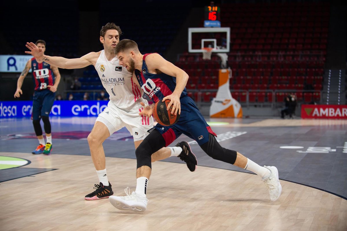 Archivo - Causeur (Real Madrid) y Giedraitis (Baskonia) - ACB PHOTO / A. BOUZO - Archivo