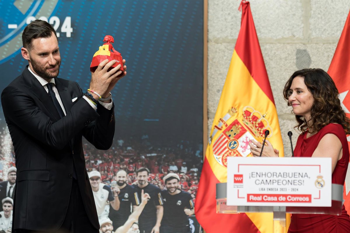 Antes de marchar, los jugadores salieron al balcón de la sede de la Comunidad para agradecer el apoyo de la afición. Además, Llull entregó a la presidenta de la Comunidad una réplica del trofeo y una camiseta firmada, mismos recuerdos que se llevó Martínez-Almeida en el Ayuntamiento, quien bromeó con la cantidad de camisetas que empieza a tener del Real Madrid.