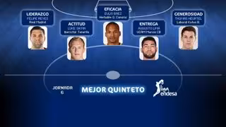 Los jugadores Felipe Reyes (Liderazgo), Eulis Báez (Eficacia), Luke Sikma (Actitud), Thomas Heurtel (Generosidad) y Augusto Lima (Entrega), conforman el Mejor Quinteto de la Jornada 6 de la Liga Endesa 2014-15.