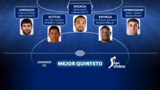 El alero del Laboral Kutxa, Fernando San Emeterio, lidera este quinteto con su 'MVP de la Jornada 26', que consiguió gracias a una completísima actuación en la victoria baskonista sobre el Valencia Basket (94-88) en el Buesa Arena, en la que anotó 14 puntos, capturó 6 rebotes, repartió 6 asistencias y sumó 6 robos.