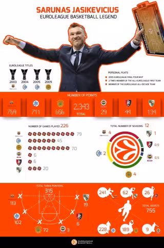 Jasikevicius, ganador de cuatro títulos de la competición, se retiró el pasado verano tras 16 años de trayectoria en las canchas. Se trata del único campeón en tres temporadas consecutivas, ganando en 2003 con el Barcelona, y en 2004 y 2005 con Maccabi Tel Aviv, y también con tres equipos diferentes, después de lograrlo también en 2009 con el Panathinaikos griego.