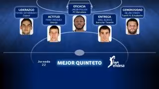 Los jugadores Tomas Satoransky (Liderazgo), Jacob Pullen (Eficacia), Fran Vázquez (Actitud), Dejan Ivanov (Generosidad) y Saúl Blanco (Entrega) conforman el Mejor Quinteto Liga Endesa de la Jornada 22.