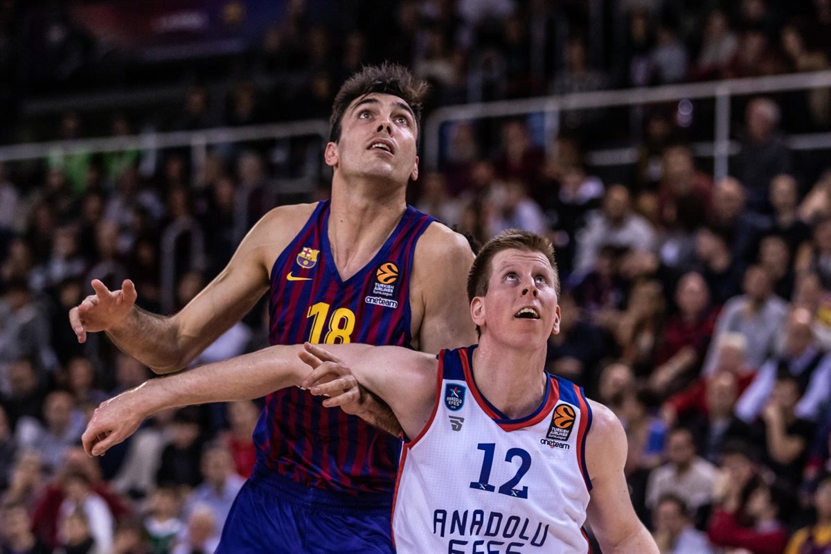 Pierre Oriola, #18 of FC Barcelona Lassa and Brock Motum, #12 of Anadolu Efes Istanbul during EuroLeague Basketball match between FC Barcelona Lassa and Anadolu Efes Istanbul on December 27, 2018 at Palau Blaugrana, in Barcelona, Spain. - Javier Borrego/AFP7 - Archivo
