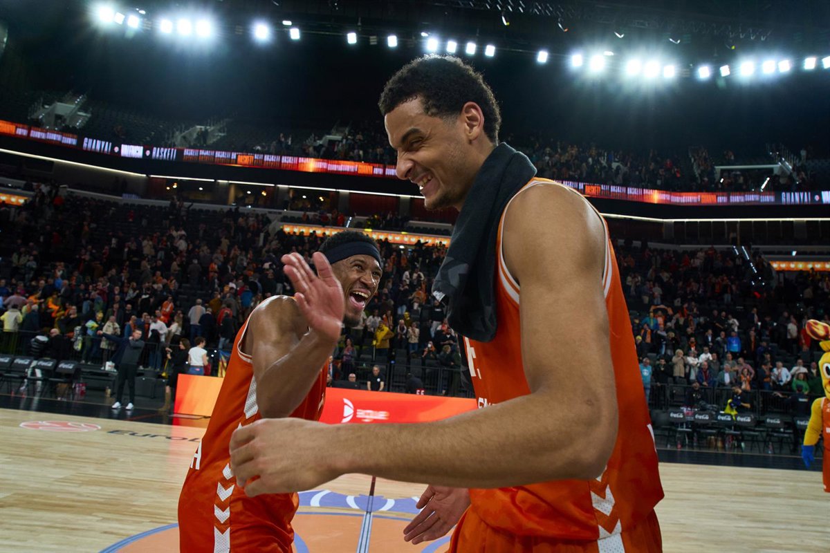 Neal Sako y Kameron Taylor (Valencia Basket) celebran un triunfo de Euroliga en el Roig Arena - Europa Press/Contacto/German Vidal Ponce