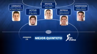 Por otro lado, el 'Clásico' entre Real Madrid y FC Barcelona, saldado con victoria local (91-78), también cobra protagonismo en este quinteto, en el que se encuentran Jaycee Carroll por su eficacia, fallando un solo tiro en un último cuarto de 19 puntos (26 en total), y Ante Tomic por su actitud, ya que sostuvo a los azulgrana con sus 22 puntos y 9 rebotes (34 de valoración).