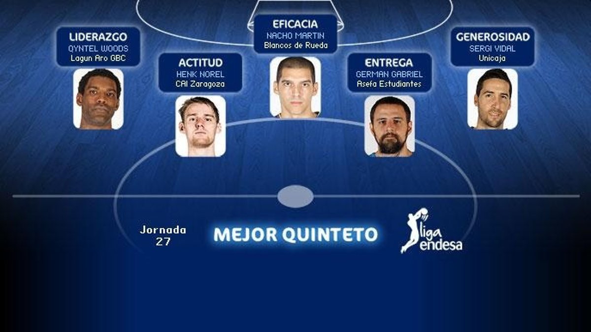 El jugador del Lagun Aro Qyntel Woods, el ala-pívot del Blancos de Rueda Valladolid Nacho Martín, el pívot del CAI Zaragoza Henk Norel, el escolta del Unicaja Sergi Vidal y el ala-pívot del Estudiantes Germán Gabriel han sido elegidos como el 'Mejor Quinteto' de la jornada 27 de la Liga Endesa.