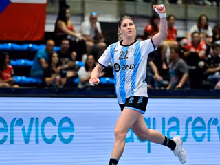 La jugadora argentina de balonmano Elke Karsten celebra un gol en el Preolímpico de Torrevieja - RFEBM / J.L. RECIO