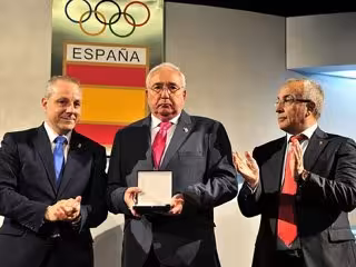Ernesto Enríquez junto a Francisco V. Blázquez (RFEBM) y Alejandro Blanco recibiendo su insignia olímpica - FEDERACIÓN MADRILEÑA DE BALONMANO - Archivo