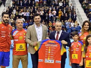 Alberto Entrerríos disfrutó de su homenaje acompañado de la familia y con sorpresa ante la novedosa y especial iniciativa desvelada por el presidente de la Federación, Francisco V. Blázquez. La trayectoria del jugador astur es dilatada con la camiseta de los 'Hispanos', único jugador junto con Albert Rocas con dos Mundiales (2005 y 2013).