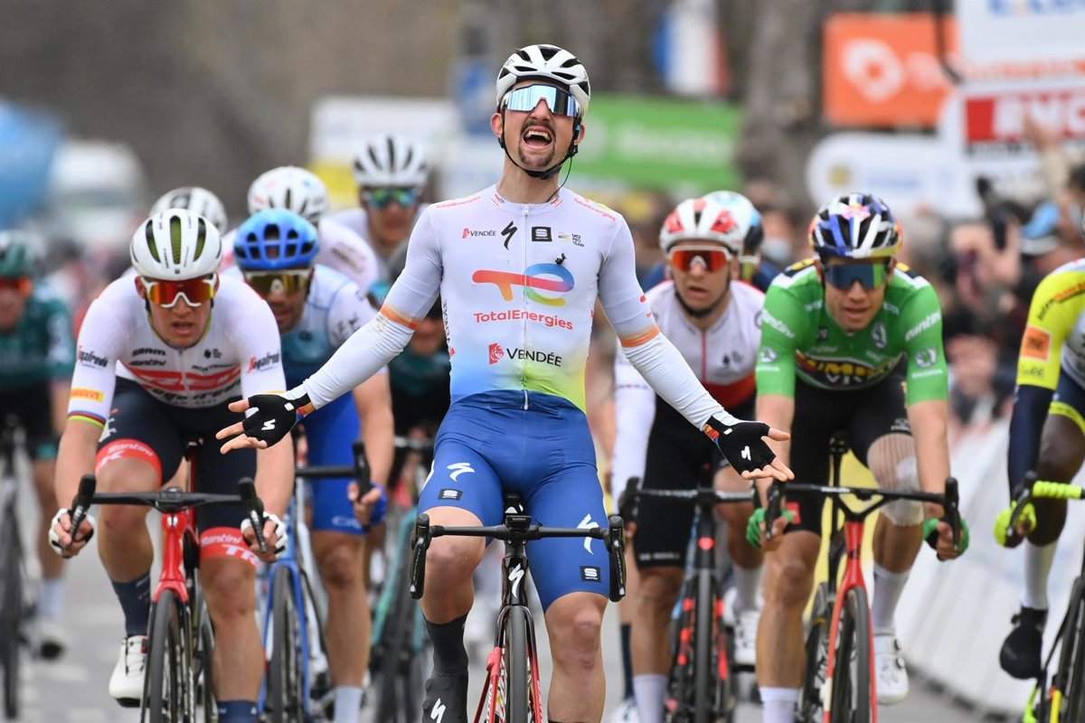 Apretó los dientes el francés para poder festejar, exhausto nada más cruzar la meta, su primera victoria profesional y la cuarta para el TotalEnergies en este arranque de temporada. Fue un final ajustado, con el mismo tiempo que el que le dieron a Mads Pedersen (Trek-Segafredo) y Wout Van Aert (Jumbo-Visma), segundo y tercero en meta.