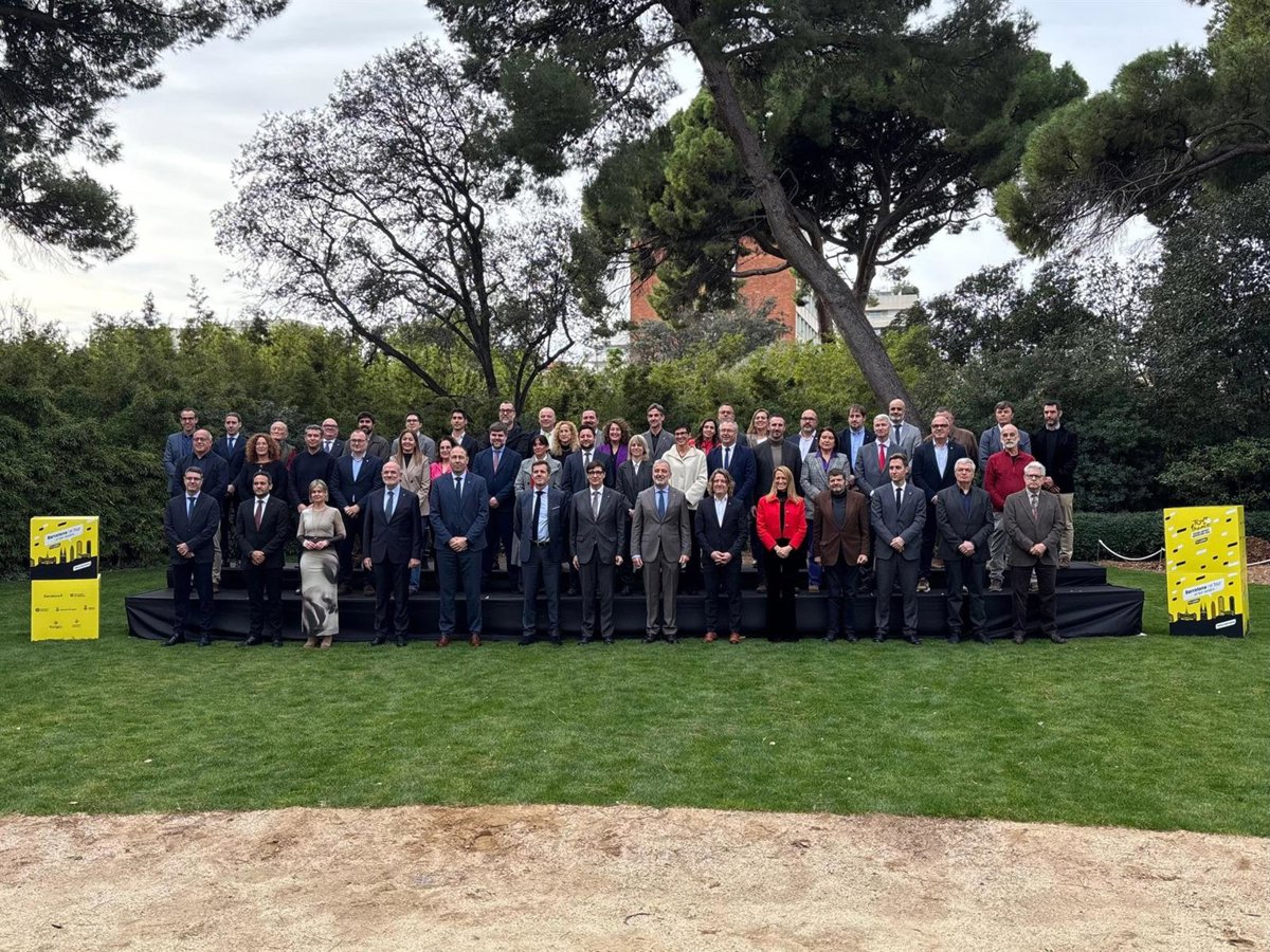 Foto de familia de los representantes institucionales en la presentación del Grand Départ del Tour de Francia con el presidente de la Generalitat, Salvador Illa, y el alcalde de Barcelona, Jaume Collboni, en el centro - EUROPA PRESS