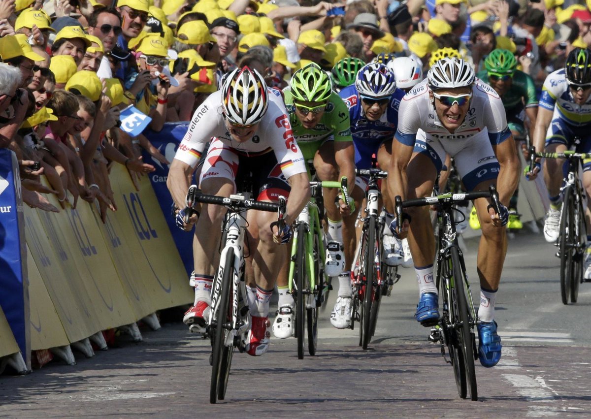Greipel arancó demasiado pronto, sus piernas se quedaron sin oxígeno a tan sólo 150 kilómetros de la pancarta en Saint Malo y Kittel, con Cavendish demasiado atrás chocando con Veelers, el lanzador de Marcel, le mostró la rueda para demostrarle que hoy es el mejor velocista del Tour del Centenario.