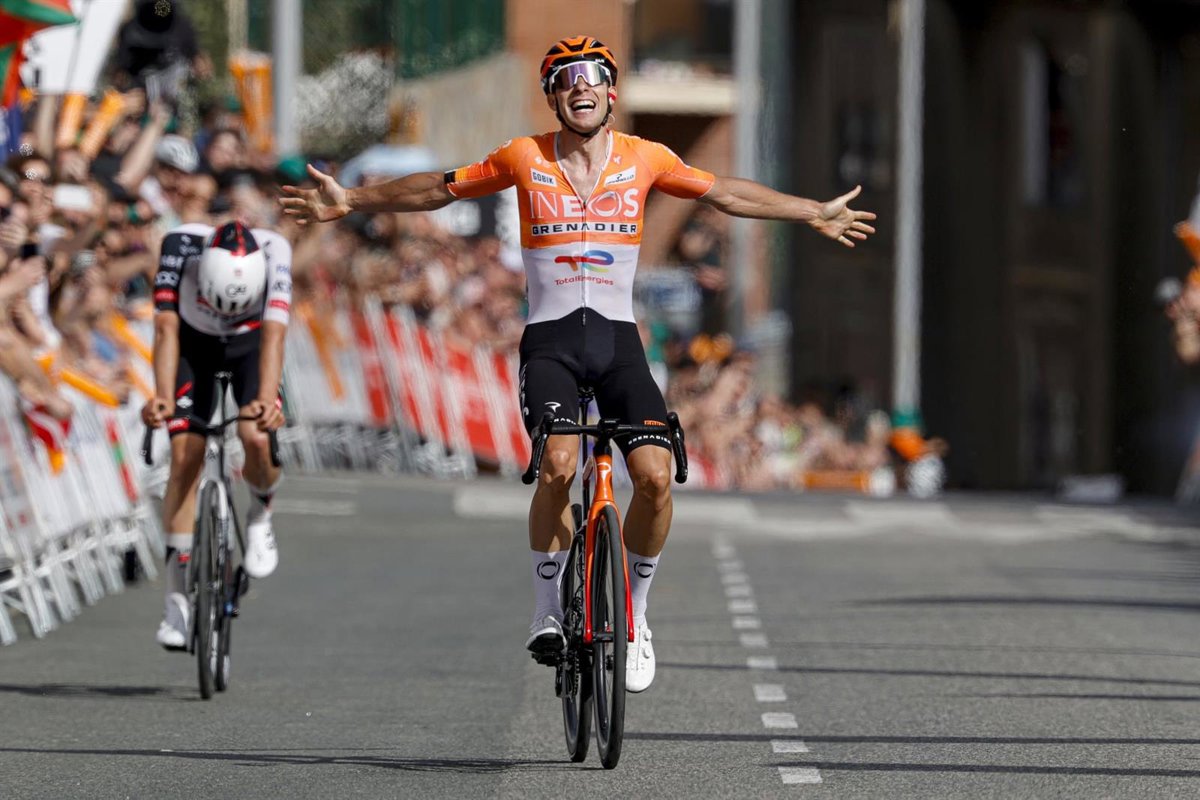 El ciclista francés Axel Laurence (INEOS Grenadiers) cruza la línea de meta en la tercera etapa de la Itzulia-Vuelta al País Vasco 2026.