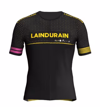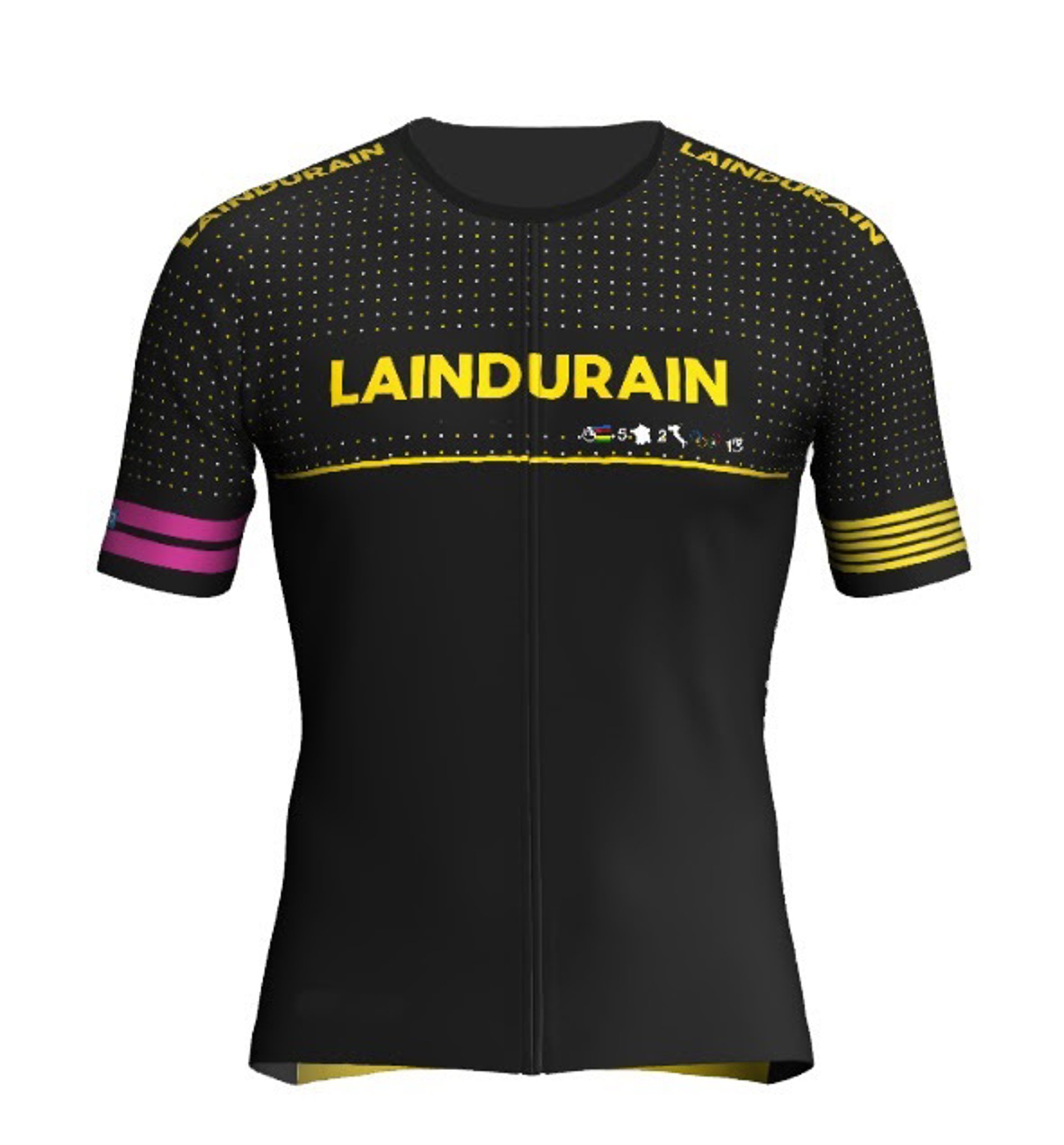 Plasmado sobre el modelo Scatto Pro de la marca Giordana, el maillot oficial de La Indurain que se entregará a todos los participantes apuesta por una base de color negro, con una parte superior con puntos blancos y amarillos donde puede leerse centrado el nombre de la prueba navarra.