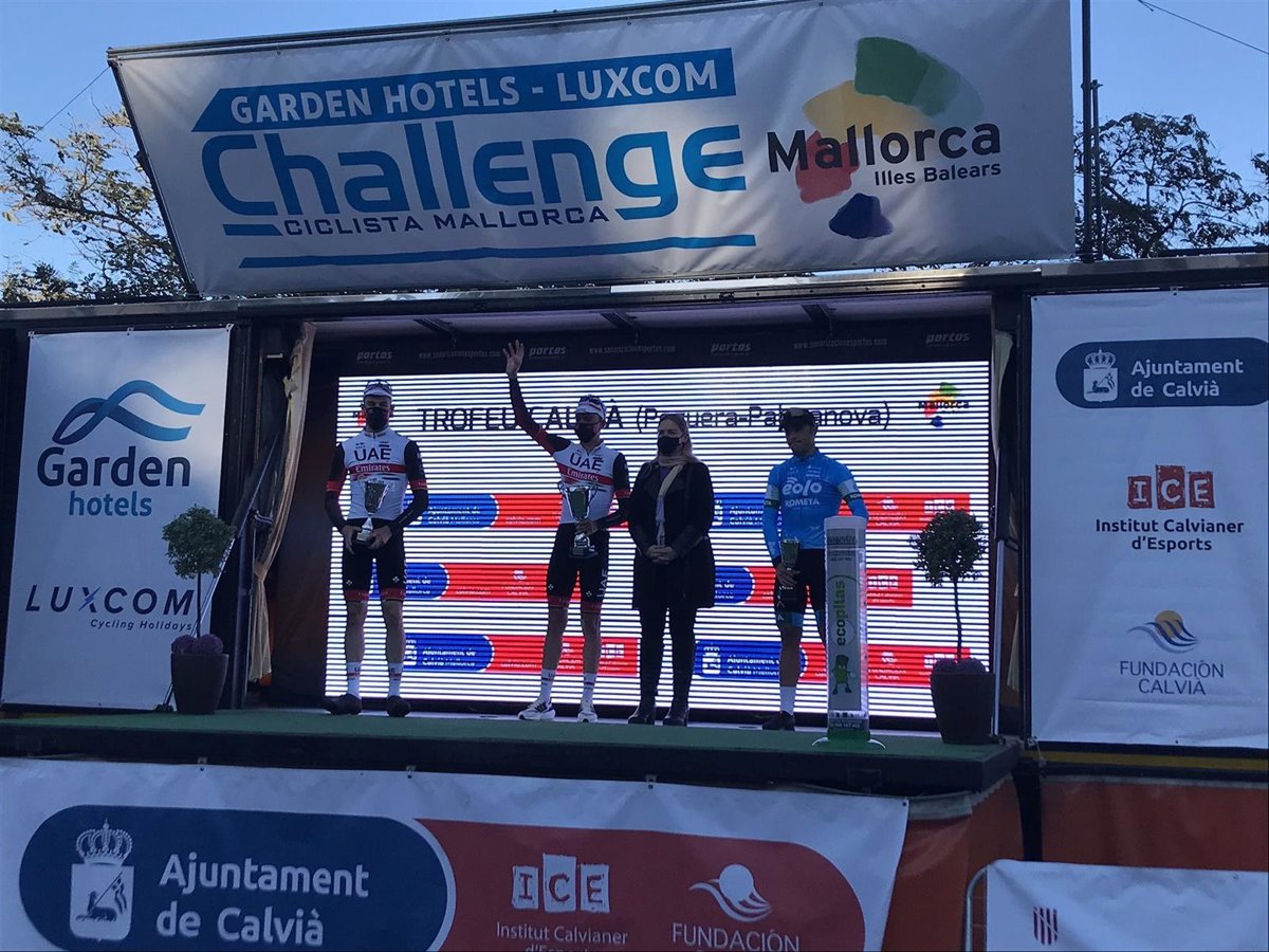 Podio del Trofeo Calvi, primera prueba de la Challenge Mallorca 2022, con victoria para el ciclista Brandon McNulty (UAE Team Emirates) - CHALLENGE MALLORCA