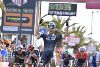 La lucha final del pelotón acabó con la larga fuga del día y permitió prepararse para lo que parecía ser un sprint, pero el austríaco, a sus 25 años y en su primera participación en el Giro de Italia, sacó a relucir su velocidad y potencia para imponerse en Olbia, en esta primera etapa sarda, al resto de velocistas y entrando además celebrando el inesperado triunfo con holgura.