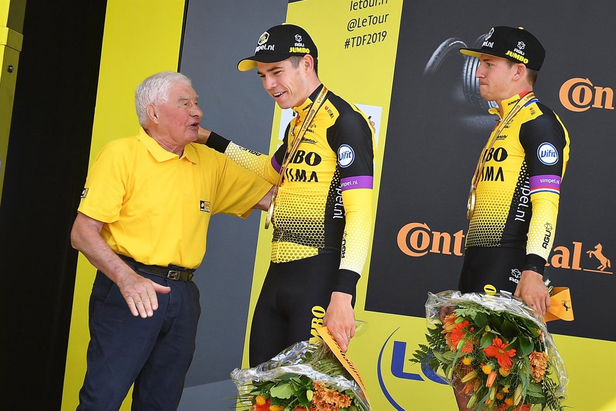 07 July 2019, Belgium, Brussels: Former French cyclist Raymond Poulidor greets Belgian Wout Van Aert of Team Jumbo-Visma on the podium of of the second stage of the 106th edition of the Tour de France cycling race, a 27,6km team time trial. Photo: David - David Stockman/BELGA/dpa - Archivo