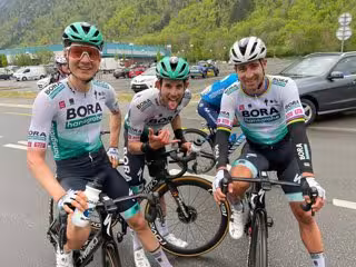 Peter Sagan (derecha), con dos compañeros del Bora-Hansgrohe tras ganar la primera etapa del Tour de Romandía 2021, disputada entre Aigle y Martigny sobre 168,1 kilómetros - @BORAHANSGROHE