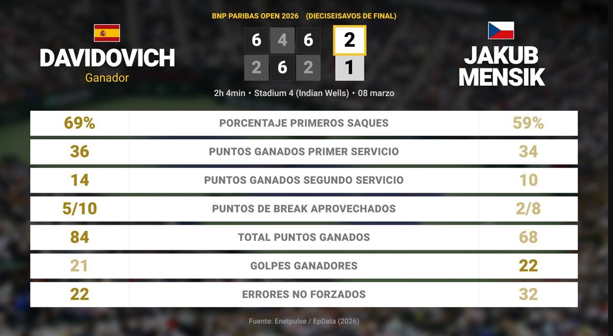 Alejandro Davidovich Fokina 2 - 1 Jakub Mensik: resumen y estadísticas del partido de BNP Paribas Open (ATP) - EUROPA PRESS (2026)