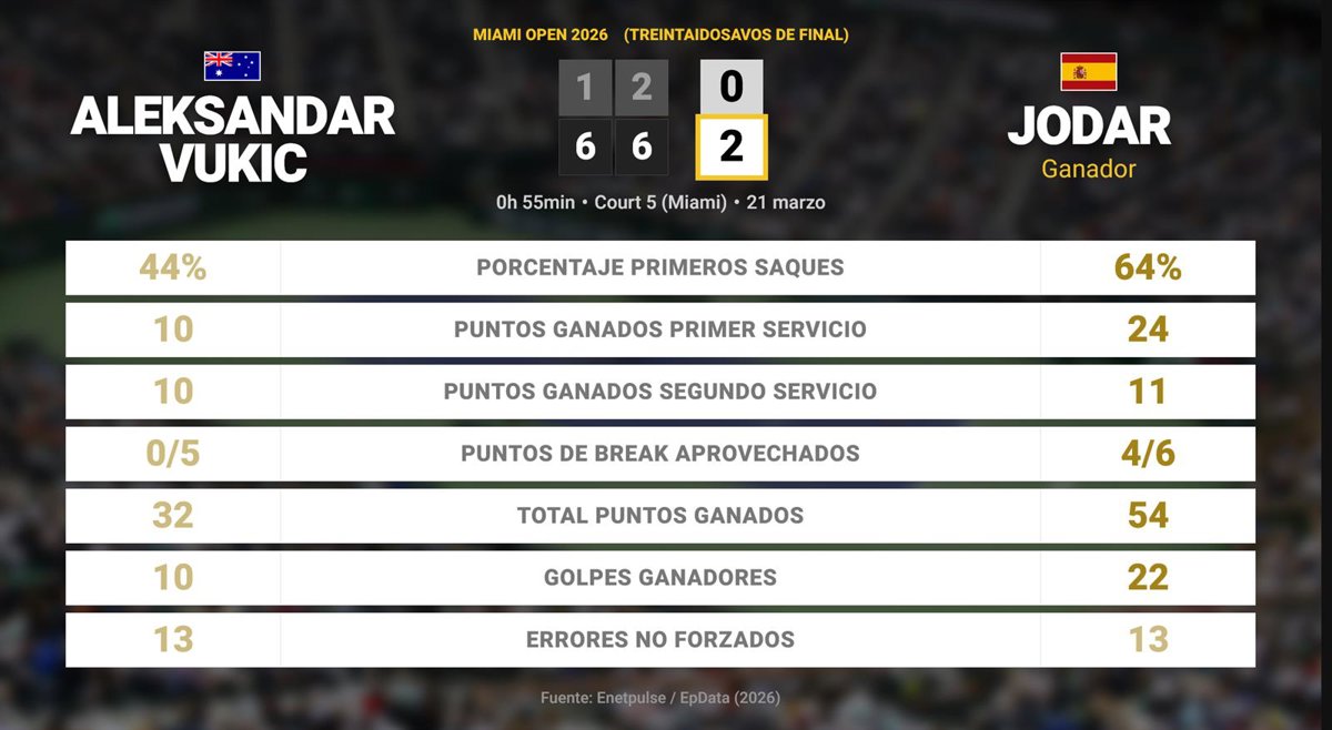 Aleksandar Vukic 0 - 2 Rafael Jodar: resumen y estadísticas del partido de Miami Open (ATP) - EUROPA PRESS (2026)