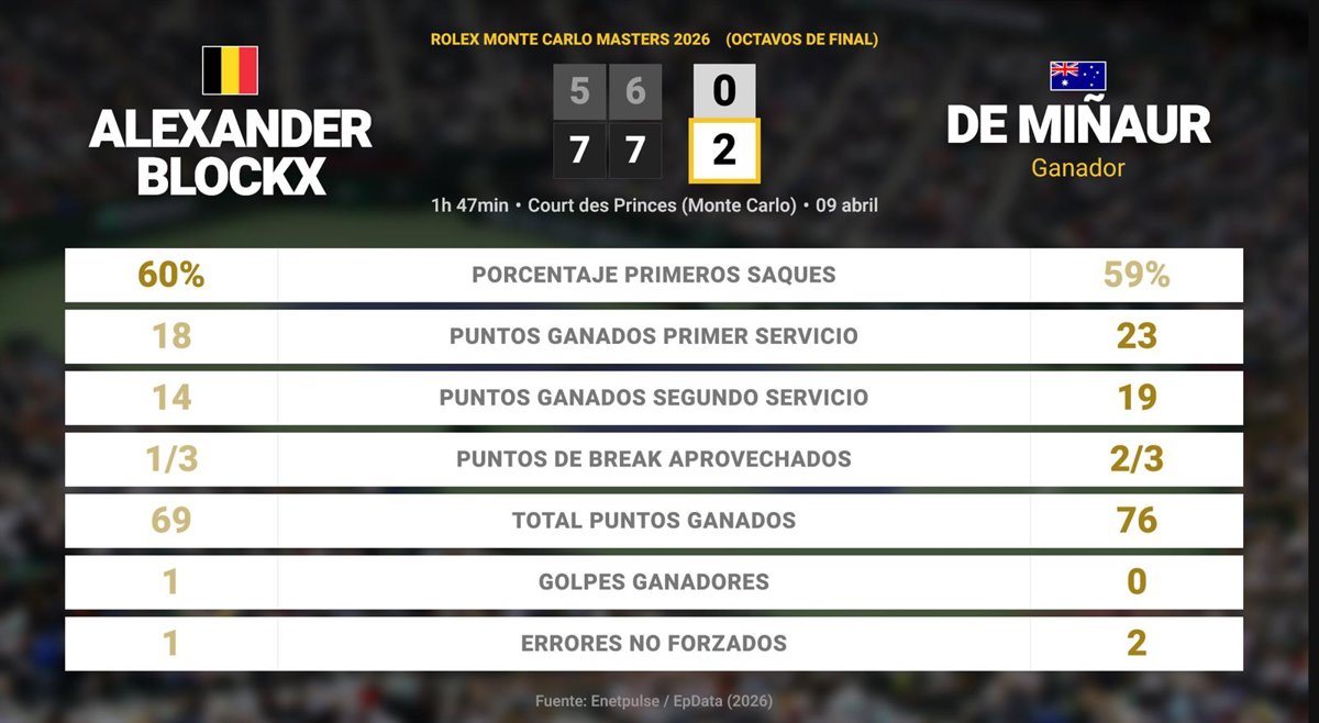 Alexander Blockx 0 - 2 Alex de Minaur: resumen y estadísticas del partido de Rolex Monte Carlo Masters (ATP) - EUROPA PRESS (2026)