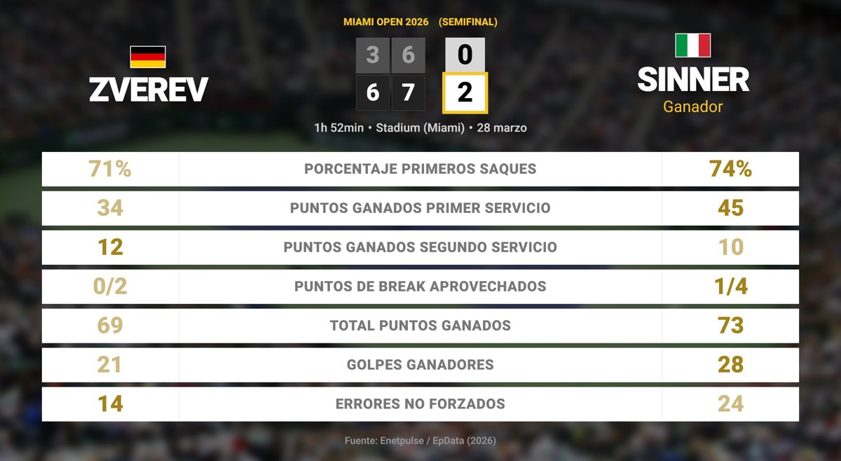 El partido entre Alexander Zverev y Jannik Sinner se disputó en la semifinal del Miami Open, un torneo ATP Tour Masters 1000 que se celebra en pista dura en Miami, Estados Unidos.