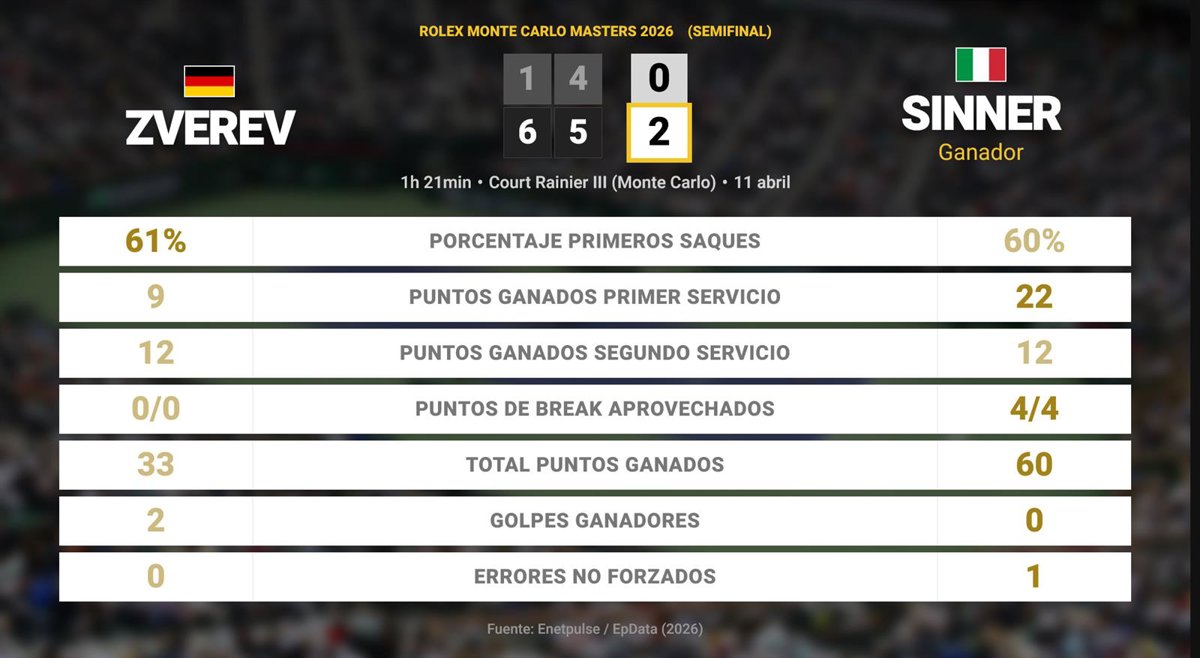 Alexander Zverev 0 - 2 Jannik Sinner: resumen y estadísticas del partido de Rolex Monte Carlo Masters (ATP) - EUROPA PRESS (2026)