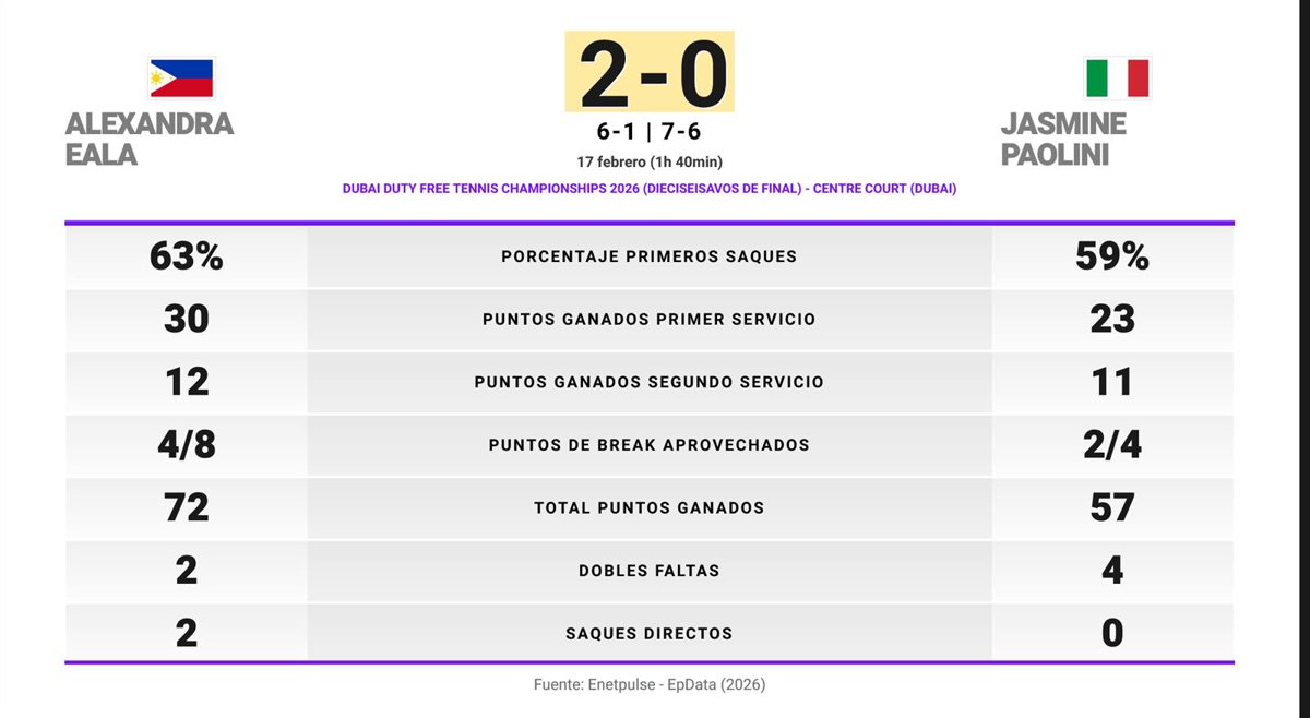 Alexandra Eala 2 - 0 Jasmine Paolini: resumen y estadísticas del partido de Dubai Duty Free Tennis Championships (WTA) - EUROPA PRESS (2026)