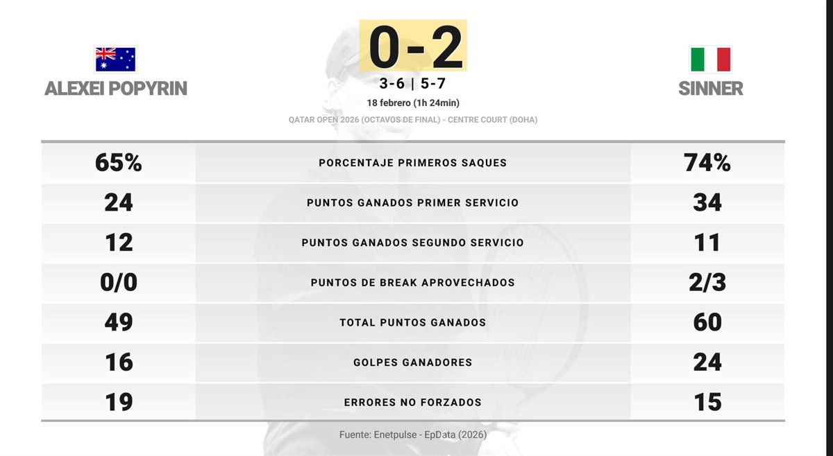 Alexei Popyrin 0 - 2 Jannik Sinner: resumen y estadísticas del partido de Qatar Open (ATP) - EUROPA PRESS (2026)