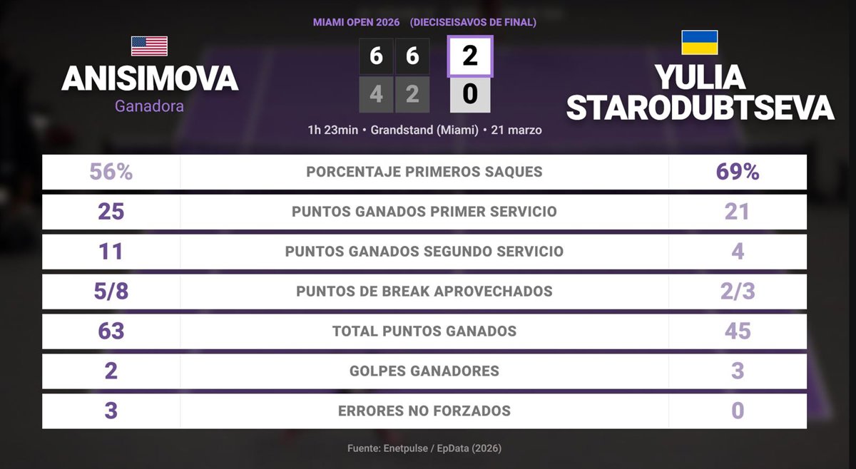 Amanda Anisimova 2 - 0 Yulia Starodubtseva: resumen y estadísticas del partido de Miami Open (WTA) - EUROPA PRESS (2026)