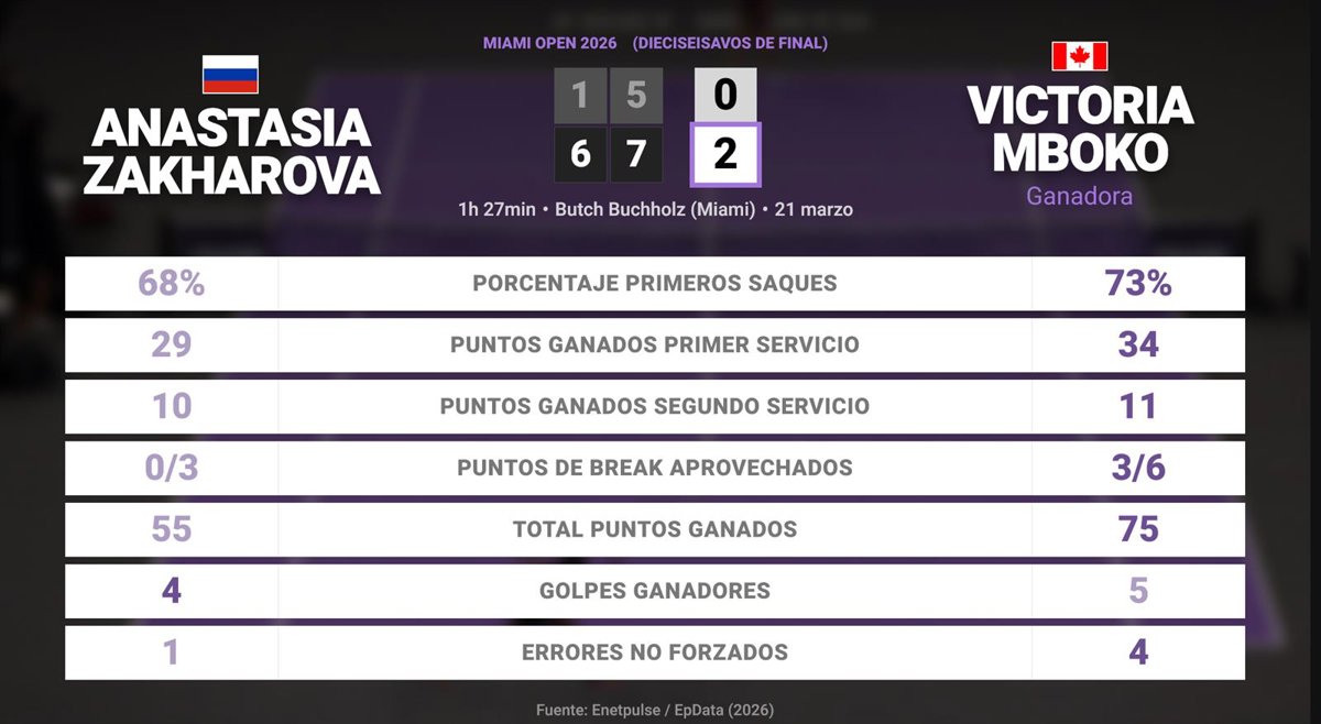 Anastasia Zakharova 0 - 2 Victoria Mboko: resumen y estadísticas del partido de Miami Open (WTA) - EUROPA PRESS (2026)