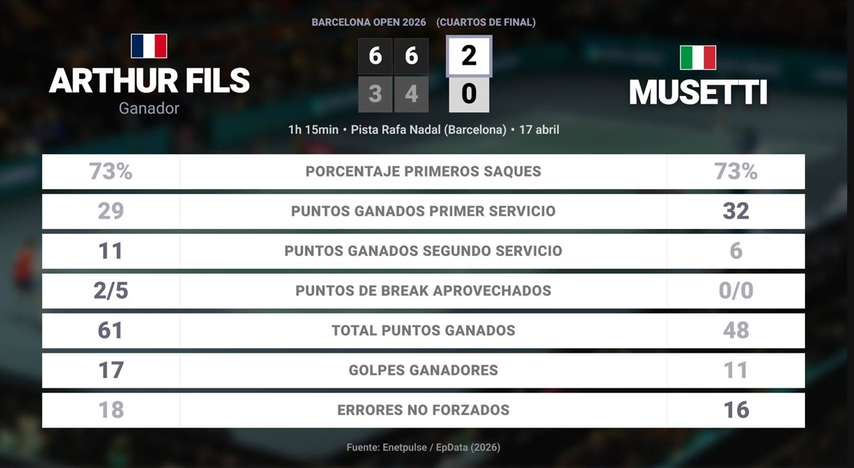 Arthur Fils 2 - 0 Lorenzo Musetti: resumen y estadísticas del partido de Barcelona Open (ATP) - EUROPA PRESS (2026)