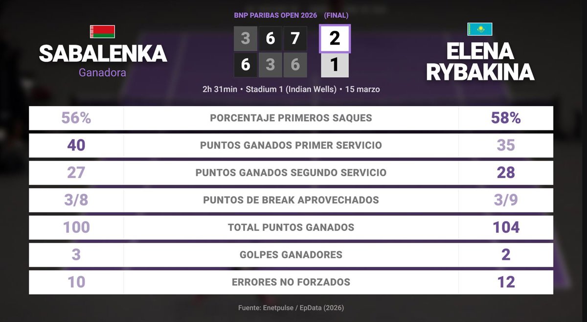 Aryna Sabalenka 2 - 1 Elena Rybakina: resumen y estadísticas del partido de BNP Paribas Open (WTA) - EUROPA PRESS (2026)