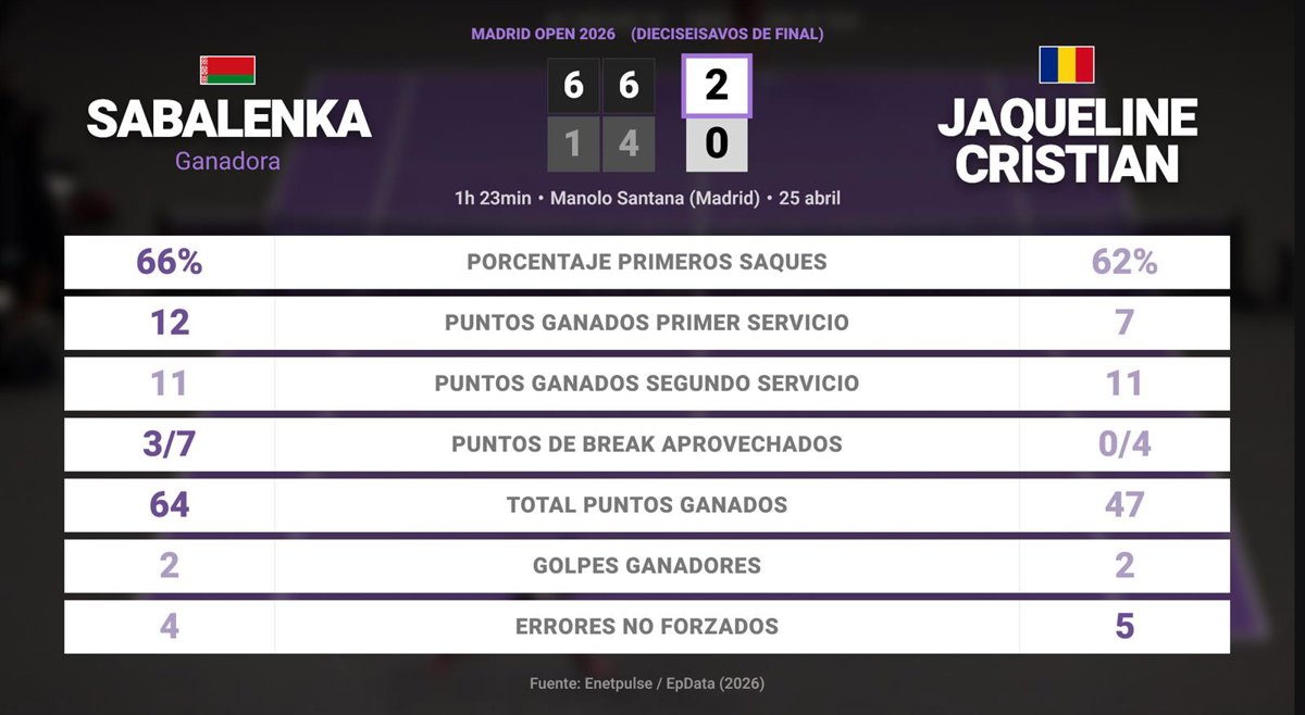 Aryna Sabalenka 2 - 0 Jaqueline Cristian: resumen y estadísticas del partido de Madrid Open (WTA) - EUROPA PRESS (2026)