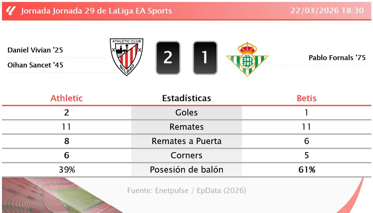 Athletic 2 - 1 Betis: resumen y estadísticas del partido de la jornada 29 de LaLiga EA Sports - EUROPA PRESS (2026)