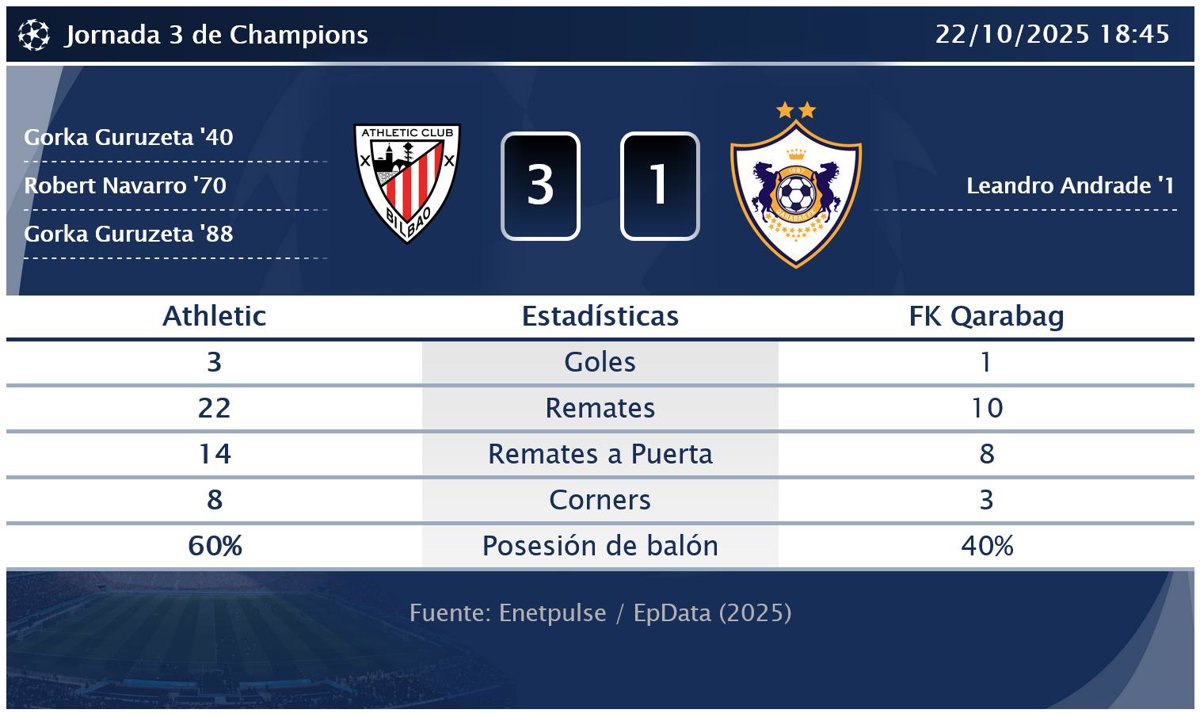 El Athletic ha ganado este miércoles por 3-1 al FK Qarabag en el primer partido de la jornada 3 de la Champions. Los goleadores del encuentro fueron Gorka Guruzeta en los minutos 40 y 88, y Robert Navarro en el 70, mientras que Leandro Andrade adelantó a los visitantes en el minuto 1.