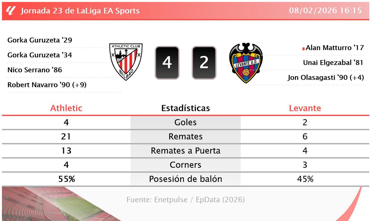 Athletic 4 - 2 Levante: resumen y estadísticas del partido de la jornada 23 de LaLiga EA Sports - EUROPA PRESS (2026)