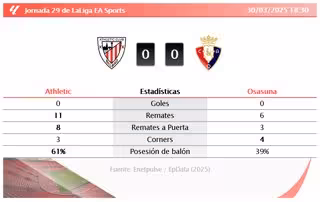 Athletic 0 - 0 Osasuna: resumen y estadísticas del partido de la jornada 29 de LaLiga EA Sports - ENETPULSE / EPDATA (2025)