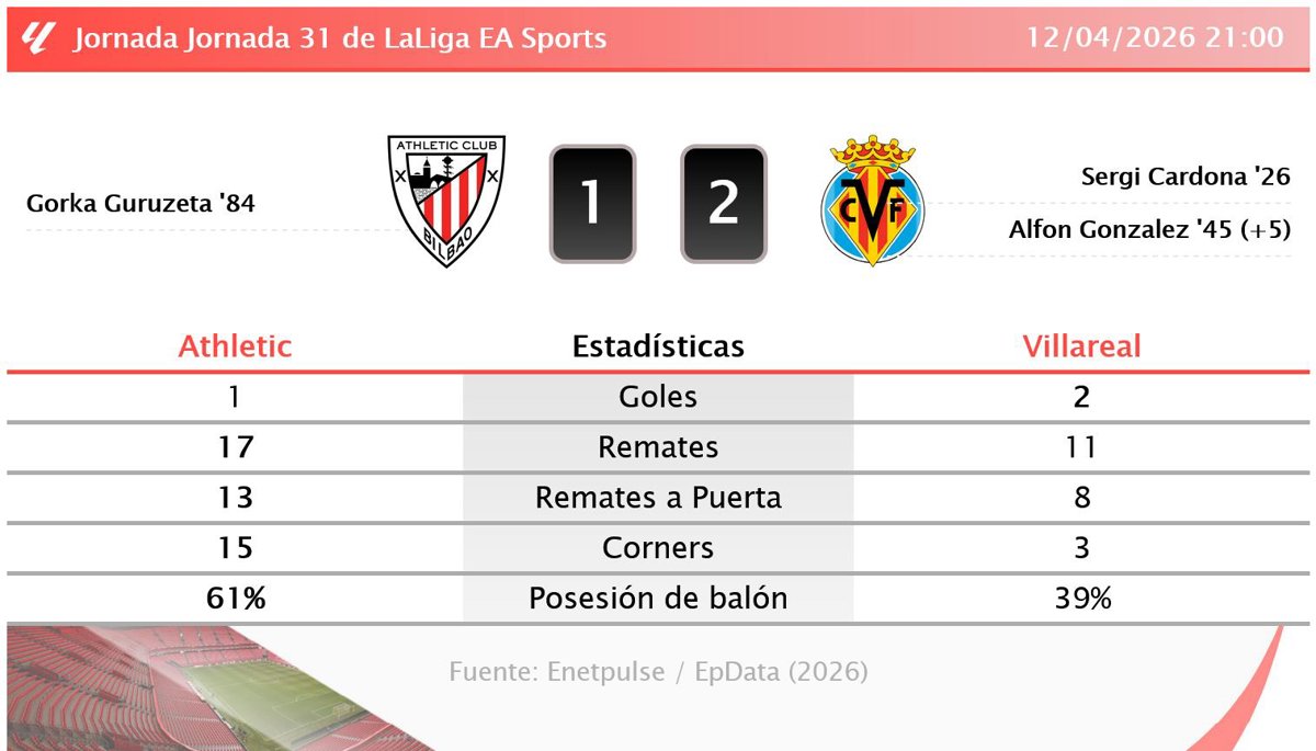 Athletic 1 - 2 Villareal: resumen y estadísticas del partido de la jornada 31 de LaLiga EA Sports - EUROPA PRESS (2026)