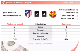 El partido comenzó con ventaja local tras un gol de Julian Alvarez en el minuto 45, pero el Barcelona remontó con tantos de Lewandowski, Ferran Torres y Lamine Yamal, sentenciando el encuentro en los minutos finales. La victoria permite al Barcelona mantener su posición en la parte alta de la tabla, igualado a puntos con el Real Madrid, mientras que el Atlético de Madrid ve frenada su progresión en la presente temporada.